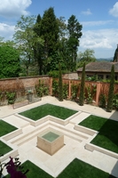 " Appresso la qual cosa, fattosi aprire un giardino che di costa era al palagio, in quello, che tutto era da torno murato, se n’entrarono; e parendo loro nella prima entrata di maravigliosa bellezza tutto insieme, piú attentamente le parti di quello cominciarono a riguardare. Esso avea dintorno da sé e per lo mezzo in assai parti vie ampissime, tutte diritte come strale e coperte di pergolati di viti, le quali facevano gran vista di dovere quello anno assai uve fare: e tutte allora fiorite sí grande odore per lo giardin rendevano, che, mescolato insieme con quello di molte altre cose che per lo giardino olivano, pareva loro essere tra tutta la spezieria che mai nacque in Oriente. [...] Nel mezzo del quale; quello che non è meno commendabile che altra cosa che vi fosse, ma molto piú; era un prato di minutissima erba e verde tanto, che quasi nera parea, dipinto tutto forse di mille varietá di fiori, chiuso dintorno di verdissimi e vivi aranci e di cedri, li quali, avendo i vecchi frutti ed i nuovi ed i fiori ancora, non solamente piacevole ombra agli occhi, ma ancora all’odorato facevan piacere. Nel mezzo del qual prato era una fonte di marmo bianchissimo e con maravigliosi intagli iv’entro, la quale, non so se da natural vena o da artificiosa, per una figura che sopra una colonna nel mezzo di quella diritta era, gittava tanta acqua e sí alta verso il cielo, che poi non senza dilettevol suono nella fonte chiarissima ricadea, che di meno avria macinato un mulino. La qual poi; quella dico, che soprabbondava al pieno della fonte; per occulta via del pratello usciva, e per canaletti assai belli ed artificiosamente fatti fuor di quello divenuta palese, tutto lo ’ntorniava [...]" "Decameron", Introduzione alla terza giornata.