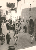 Nell'immagine la parata dalla Casa verso Palazzo Pretorio, dove si svolsero i festeggiamenti della riapertura: i gonfaloni dei vari comuni del circondario presenti alla cerimonia.