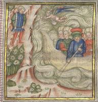 Kassel, Universitätsbibliothek Kassel, Landesbibliothek und Murhardsche Bibliothek der Stadt Kassel, 2° poet. et roman. 3, f. 135v. Seduto melanconicamente nel giardino, Filocolo ha una visione: una gigantesca figura femminile tenta di affondare una barca sulla quale si trovano una fanciulla nuda abbracciata da un giovane e lo stesso Filocolo, insieme alle personificazioni delle tre Virtù teologali e delle quattro Virtù cardinali.