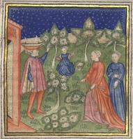Kassel, Universitätsbibliothek Kassel, Landesbibliothek und Murhardsche Bibliothek der Stadt Kassel, 2° poet. et roman. 3, f. 116r. I giovani discutono con Fiammetta seduti nel giardino.