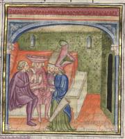 Kassel, Universitätsbibliothek Kassel, Landesbibliothek und Murhardsche Bibliothek der Stadt Kassel, 2° poet. et roman. 3, f. 143v. La carta presenta due miniature: Filocolo giustifica le sue azioni dinanzi all'arabo Sadoc e ai suoi sergenti; Filocolo segue Sadoc ed i suoi uomini a cavallo.