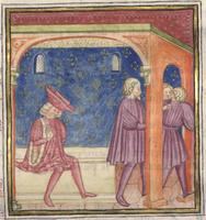 Kassel, Universitätsbibliothek Kassel, Landesbibliothek und Murhardsche Bibliothek der Stadt Kassel, 2° poet. et roman. 3, f. 145r. Gli amici di Filocolo accolgono il suo ritorno alle porte della città.