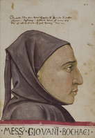 Venezia, Biblioteca Nazionale Marciana, It. X.127, f. 47r. Il copista del manoscritto, datato 14 marzo 1450, è Pacchio di Bernardo di Pacchio Adimari. Ritratto di profilo dell'autore Giovanni Boccaccio.