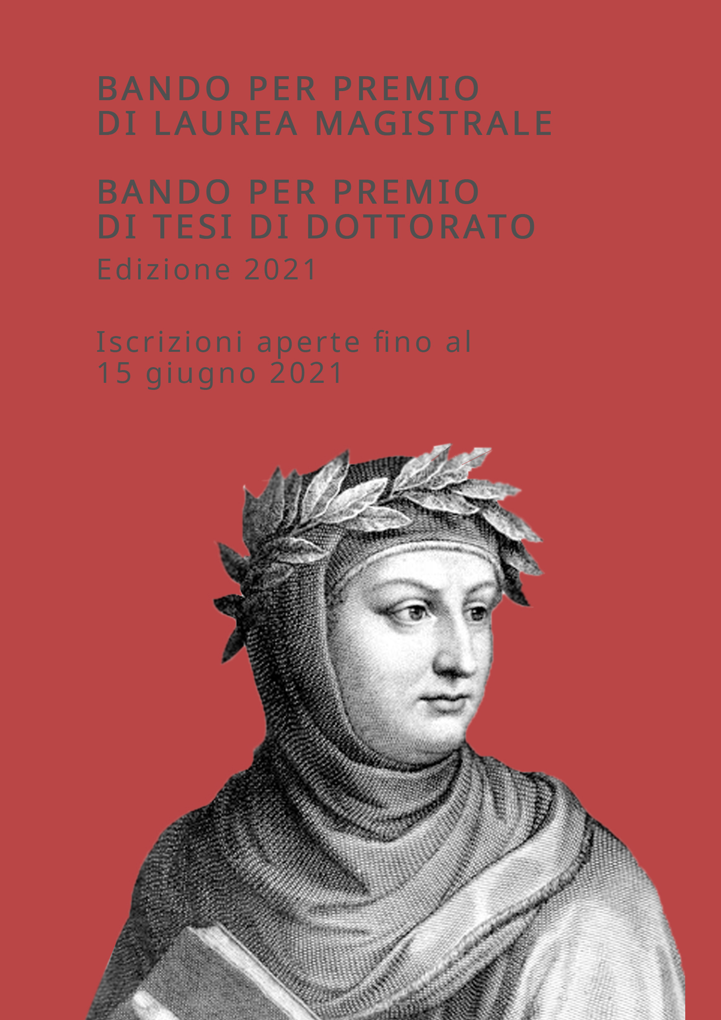 L’Ente Nazionale Giovanni Boccaccio, l’Associazione Letteraria Giovanni Boccaccio e il Comune di Certaldo bandiscono un premio per la migliore Tesi di Laurea Magistrale (M. A.) e la migliore Tesi di Dottorato (Ph. D.) riguardante la figura, l’opera e la fortuna di Boccaccio, discussa in Università italiane o straniere dal 2016 ad oggi.
