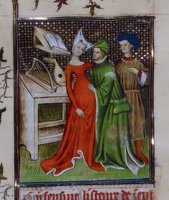 Londra, British Library, Royal 20 C V, f. 121r. Sempronia viene corteggiata da un uomo; accanto ai due si trovano un altro personaggio maschile e un tavolo su cui sono poggiati degli strumenti musicali ed un libro.