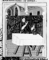 Parigi, Bibliothèque Nationale de France, Fr. 232, f. 259r. Un uomo ingordo siede a tavola mangiando e bevendo.