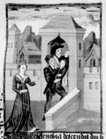 Parigi, Bibliothèque Nationale de France, Fr. 232, f. 288v. Giovanni Boccaccio incontra due uomini.