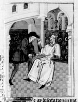 Parigi, Bibliothèque Nationale de France, Fr. 232, f. 298v. Due sovrani si presentano dinanzi a Giovanni Boccaccio, il quale è seduto in cattedra.
