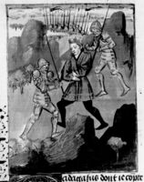 Parigi, Bibliothèque Nationale de France, Fr. 232, f. 292v. Radagaiso viene catturato dai soldati dell'esercito di Stilicone.