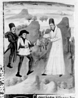 Parigi, Bibliothèque Nationale de France, Fr. 232, f. 230v. Giovanni Boccaccio incontra due uomini.