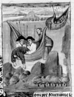 Parigi, Bibliothèque Nationale de France, Fr. 232, f. 233r. Sesto Pompeo comanda una nave pirata.