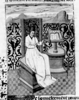 Parigi, Bibliothèque Nationale de France, Fr. 232, f. 222v. L'autore Giovanni Boccaccio seduto accanto ad un leggio.