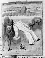Parigi, Bibliothèque Nationale de France, Fr. 232, f. 223r. Due uomini trasportano il cadavere di un re.