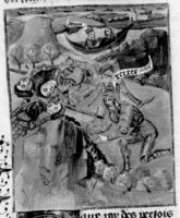 Parigi, Bibliothèque Nationale de France, Fr. 232, f. 86v. Serse, sconfitto in battaglia, si disseta a una pozza del sangue dei suoi cavalieri; Serse attraversa l'Ellesponto sulla barca di un pescatore.