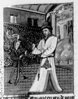 Parigi, Bibliothèque Nationale de France, Fr. 232, f. 119v. L'autore Giovanni Boccaccio conversa con Dionigi di Siracusa.