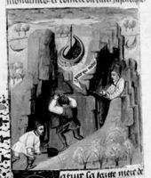 Parigi, Bibliothèque Nationale de France, Fr. 232, f. 105v. Tre minatori lavorano con vanghe e picconi; un battello trasporta il carico da loro estratto.