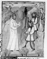 Parigi, Bibliothèque Nationale de France, Fr. 232, f. 82r. Cambise si reca a cavallo in visita al mago Oropaste.