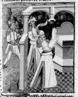 Parigi, Bibliothèque Nationale de France, Fr. 232, f. 42v. Atalia fa seppellire il marito Ioram; Atalia all'interno della città si rivolge ad un soldato.