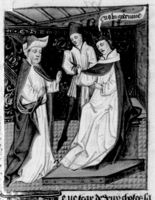 Parigi, Bibliothèque Nationale de France, Fr. 232, f. 61v. Re Candaule mostra a Gige la bellezza della moglie addormentata (qui rappresentata vestita per errore).