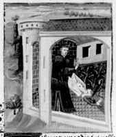 Parigi, Bibliothèque Nationale de France, Fr. 232, f. 35r. L'autore Giovanni Boccaccio seduto nel suo studio.