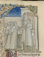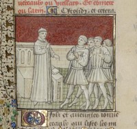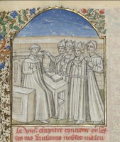 Parigi, Bibliothèque interuniversitaire Sainte-Geneviève, 1128, f. 335v. Riccardo I d'Inghilterra concede a Guido di Lusignano il permesso di partire per Cipro.