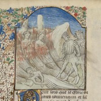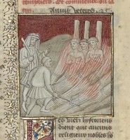 Parigi, Bibliothèque interuniversitaire Sainte-Geneviève, 1128, f. 352v. Filippa da Catania e i suoi due figli, Roberto e Sancia, vengono arsi sul rogo.