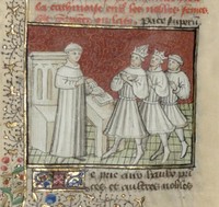 Parigi, Bibliothèque interuniversitaire Sainte-Geneviève, 1128, f. 338r. Giovanni Boccaccio incontra tre sovrani sfortunati.