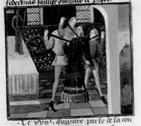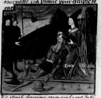 Parigi, Bibliothèque Nationale de France, Fr. 230, f. 22r. Il copista del manoscritto è P. Droulin. Egisto uccide Agamennone con l'aiuto di Clitennestra, colpendolo alle spalle mentre si toglie il mantello.