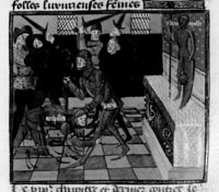 Parigi, Bibliothèque Nationale de France, Fr. 230, f. 34v. Il copista del manoscritto è P. Droulin. Un gruppo di uomini e donne orgogliosi, seduti intorno a un tavolo, vivono del duro lavoro dei poveri.