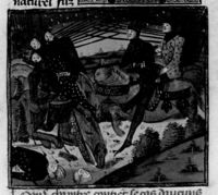 Parigi, Bibliothèque Nationale de France, Fr. 230, f. 36v. Il copista del manoscritto è P. Droulin. Re Zara viene ucciso da Asa durante una battaglia.