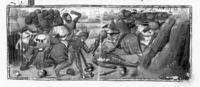 Parigi, Bibliothèque Nationale de France, Fr. 233, f. 35r. Saul compie il suicidio trafiggendosi con la spada accanto ai soldati morti sul campo di battaglia.