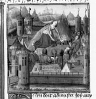 Parigi, Bibliothèque Nationale de France, Fr. 233, f. 43v. Il popolo cartaginese assiste al suicidio di Didone, che salita sulle mura della città si pugnala e si getta sulla pira funebre.