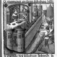 Parigi, Bibliothèque Nationale de France, Fr. 234, f. 31r. Durante l'assedio di Argo, Pirro viene colpito a morte da un masso lanciato da una catapulta; un soldato presenta la testa di Pirro ad Antigono re di Macedonia.