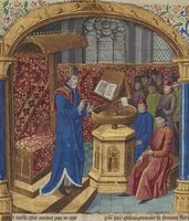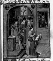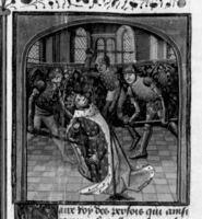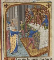 Parigi, Bibliothèque Nationale de France, Fr. 233, f. 37v. Roboamo, seduto sul trono, ascolta le suppliche dei suoi sudditi.
