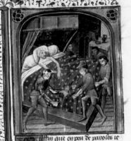 Parigi, Bibliothèque Nationale de France, Fr. 234, f. 20v. Agatocle ordina il massacro dei giovani siracusani per vendicarsi del tradimento dei soldati; sul letto di morte Agatocle ordina alla moglie e ai figli di fuggire in Egitto.