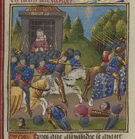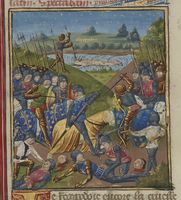 Parigi, Bibliothèque Nationale de France, Fr. 234, f. 10v. Due eserciti si scontrano in battaglia; un uomo trascina a riva il cadavere di Alessandro I re dell'Epiro, caduto nel fiume Acheronte dopo essere stato trafitto da un dardo.