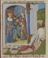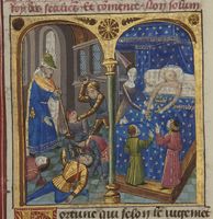 Parigi, Bibliothèque Nationale de France, Fr. 234, f. 36v. La morte di Beronice, moglie di Antioco II, e di uno dei suoi figli; Antioco viene assassinato (errore).