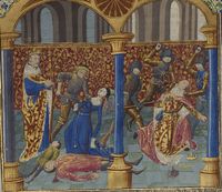 Parigi, Bibliothèque Nationale de France, Fr. 233, f. 80r. Serse viene assassinato nel palazzo dalle sue guardie.