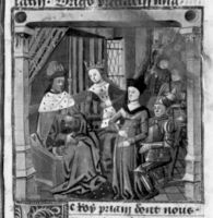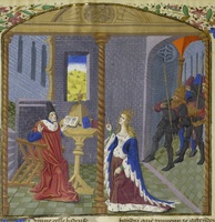 Parigi, Bibliothèque Nationale de France, Fr. 233, f. 22r. Priamo ed Ecuba accolgono Paride ed Elena al loro arrivo a Troia.