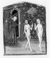 Parigi, Bibliothèque Nationale de France, Fr. 233, f. 3r. Dio crea Eva dalla costola di Adamo addormentato; Adamo ed Eva vengono tentati dal serpente a cogliere il frutto proibito dall'albero; Adamo ed Eva vengono cacciati dal Paradiso Terrestre da un angelo con la spada sguainata.