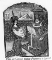 Parigi, Bibliothèque Nationale de France, Fr. 132, f. 102v. La Fortuna, una donna dalle molte braccia, appare a Boccaccio mentre questi si trova nel suo studio.