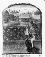 Parigi, Bibliothèque Nationale de France, Fr. 132, f. 1r. L'autore Giovanni Boccaccio siede nel suo studio intento a comporre il manoscritto, affiancato da tre personaggi tra cui compare Louis de Bruges, dedicatario dell'opera; all'esterno si trova un gruppo di uomini e donne, appartenenti a diverse classi sociali, colpiti dalla sfortuna; sullo sfondo, Laurent de Premierfait offre il libro al re di Francia.