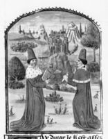 Parigi, Bibliothèque Nationale de France, Fr. 132, f. 140v. Francesco Petrarca appare a Giovanni Boccaccio.