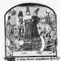 Parigi, Bibliothèque Nationale de France, Fr. 233, f. 34v. Un gruppo di uomini colpiti dalla sfortuna compare dinanzi a Giovanni Boccaccio.