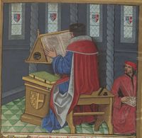 Parigi, Bibliothèque Nationale de France, Fr. 231, f. 1r. Giovanni Boccaccio, seduto ad un leggio, sfoglia il manoscritto dell'opera mentre Laurent de Premierfait siede accanto all'autore ed esegue la traduzione del libro.