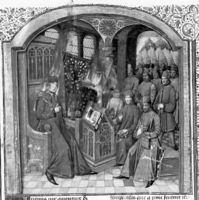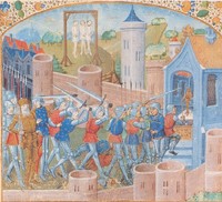 Parigi, Bibliothèque de l'Arsenal, 5281, f. 1r. La miniatura illustre le conseguenze negative della guerra: due eserciti si scontrano sul campo di battaglia; un cavaliere inseguito dai nemici prega inginocchiato in un tempio; sullo sfondo, tre cadaveri pendono da una forca.