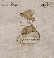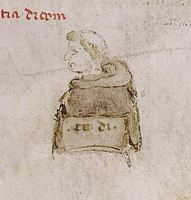 Berlino, Staatsbibliothek – Preußischer Kulturbesitz, Hamilton 90, f. 79v. Manoscritto autografo di Giovanni Boccaccio. Busto di Gianni Lotteringhi, o più probabilmente la "fantasima" evocata nel racconto, in corrispondenza del richiamo "pare".
