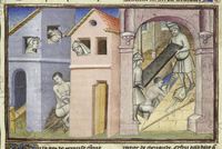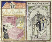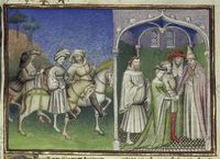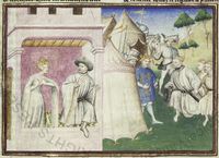 Città del Vaticano, Biblioteca Apostolica Vaticana, Pal. lat. 1989, f. 29v. Il copista del manoscritto, datato 15 giugno 1414, è Laurent de Premierfait. Una gentildonna di Guascogna viene aggredita da un uomo armato sull'isola di Cipro; la donna, in ginocchio al cospetto del re, chiede giustizia per le ingiurie subite.