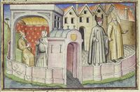 Città del Vaticano, Biblioteca Apostolica Vaticana, Pal. lat. 1989, f. 18r. Il copista del manoscritto, datato 15 giugno 1414, è Laurent de Premierfait. Al cospetto del Saladino, Melchisedech racconta la parabola dei tre anelli; i due uomini, divenuti amici, attraversano la città.