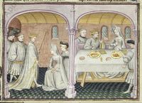 Città del Vaticano, Biblioteca Apostolica Vaticana, Pal. lat. 1989, f. 22r. Il copista del manoscritto, datato 15 giugno 1414, è Laurent de Premierfait. La marchesa del Monferrato accoglie nella sua dimora il re Filippo il Bornio ed il suo seguito; la marchesa offre al re un banchetto a base di galline.